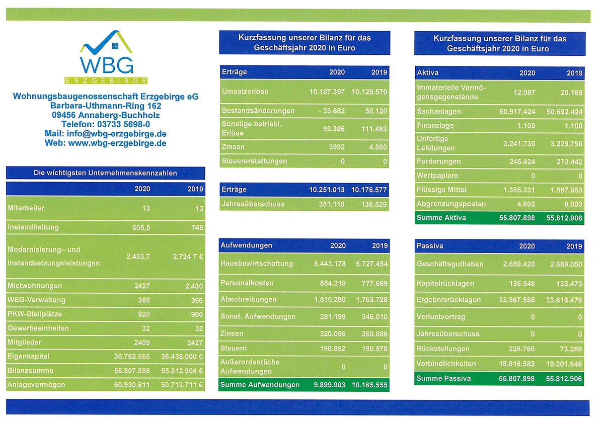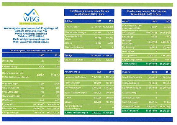 Nebenstehend finden Sie in Kurzfassung die wichtigsten Kennziffern unserer Genossenschaft zum Jahresabschluss 2020.