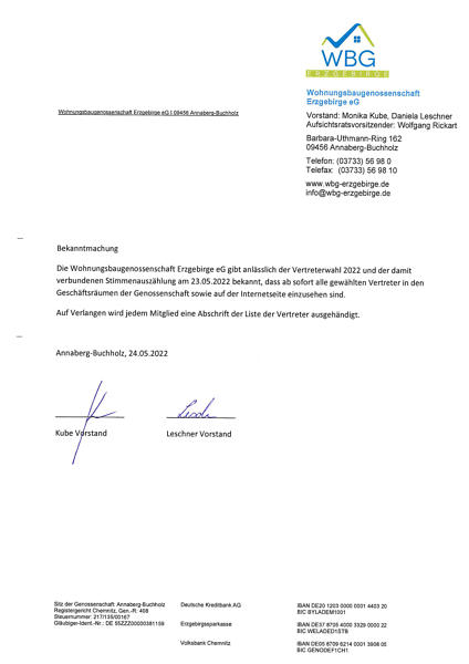 Die Wohnungsbaugenossenschaft Erzgebirge eG gibt anlässlich der Vertreterwahl 2022 und der damit verbundenen Stimmenauszählung am 23.05.2022 bekannt, dass ab sofort alle gewählten Vertreter in den Geschäftsräumen der Genossenschaft sowie auf der Internetseite einzusehen sind.