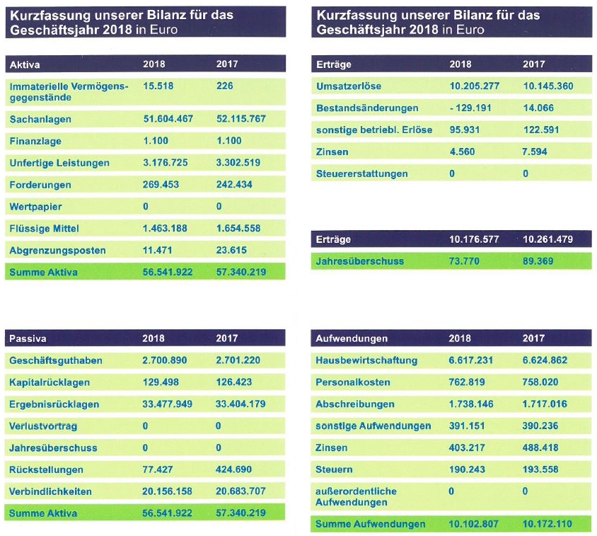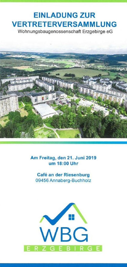 Die Unterlagen zum Jahresabschluss für das Geschäftsjahr 2018 sowie die Neufassung der Satzung können in der Geschäftsstelle der Wohnungsbaugenossenschaft Erzgebirge eG eingesehen werden.
